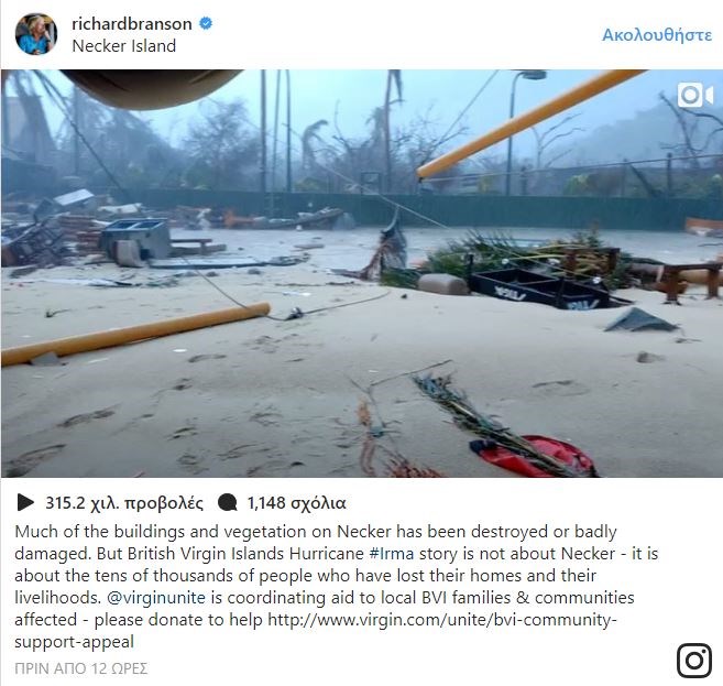 «Τα περισσότερα από τα κτήρια και η χλωρίδα του Νέκερ έχουν καταστραφεί εντελώς ή έχουν υποστεί σοβαρές ζημιές. Καταλάβαμε την πλήρη ισχύ του πιο δυνατού τυφώνα που χτύπησε ποτέ τον Ατλαντικό Ωκεανό. Αλλά είμαστε πολύ τυχεροί που είχαμε χτίσει ένα πολύ ανθεκτικό κελάρι στο κυρίως σπίτι του Νέκερ και όλες οι ομάδες μας που έμειναν στο νησί είναι καλά και ασφαλής», έγραψε στο μπλογκ του Μπράνσον.