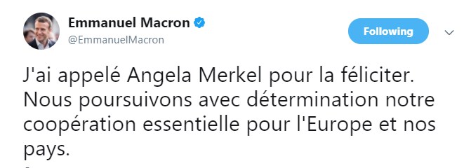 «Τηλεφώνησα στην Άνγκελα Μέρκελ για να τη συγχαρώ. Συνεχίζουμε με αποφασιστικότητα τη ζωτικής σημασίας για την Ευρώπη και για τις χώρες μας συνεργασία μας», ανέφερε ο Μακρόν με ανάρτησή του στο Twitter.