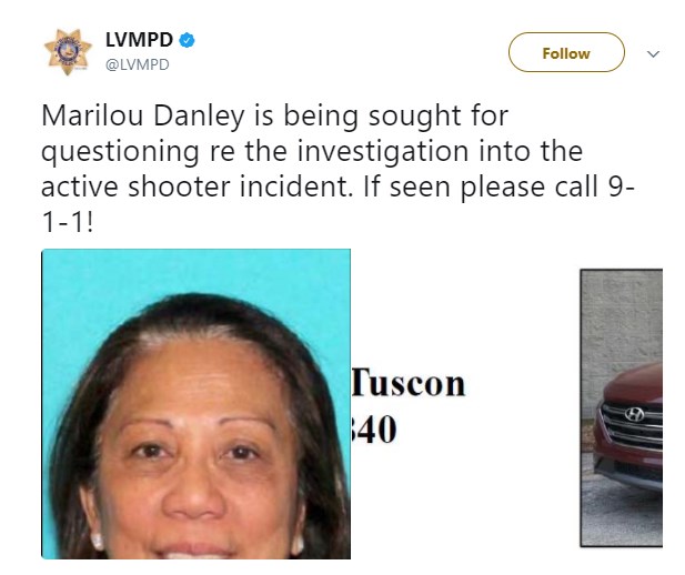 Η αστυνομία του Λας Βέγκας έδωσε στη δημοσιότητα τη φωτογραφίας μίας γυναίκας, της Marilou Danley, την οποία αναζητεί για να την ανακρίνει σχετικά με τη φονική επίθεση στο Mandalay Bay.