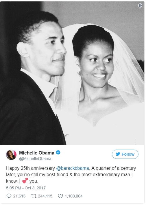 Ο πρώην Πρόεδρος των ΗΠΑ Μπαράκ Ομπάμα, έχει αποδείξει πάρα πολλές φορές κατά το παρελθόν την απεριόριστη αγάπη του στη σύζυγό του Μισέλ. Η αγάπη τους, ο «φρέσκος» έρωτάς τους και η μεταξύ τους σχέση, έχει γίνει επανειλημμένως θέμα στα διεθνή ΜΜΕ, κατά τη διάρκεια της οκταετούς θητείας του, χωρίς ποτέ οι δυο τους να δώσουν αφορμή για αρνητικά σχόλια.Την Τρίτη ο Μπαράκ και η Μισέλ Ομπάμα συμπλήρωσαν 25 χρόνια γάμου. Η Μισέλ βρισκόταν στην Πενσυλβάνια, για να μιλήσει σε εκδήλωση για τις γυναίκες και ο σύζυγός της αποφάσισε να της κάνει μία έκπληξη.Έτσι, ετοίμασε ένα βίντεο, το οποίο προβλήθηκε κατά τη διάρκεια της ομιλίας της.«Έπρεπε να σας διακόψω γιατί σήμερα συμπληρώνουμε 25 χρόνια γάμου με τη Μισέλ. Το γεγονός ότι με ανέχθηκες για ένα τέταρτο του αιώνα είναι μια αξιοσημείωτη απόδειξη για το τι είσαι ένας υπέροχος και υπομονετικός άνθρωπος. Ήταν πολύ πιο εύκολο για μένα, όχι μόνο επειδή είσαι μια υπέροχη σύντροφος, όχι μόνο γιατί είσαι μια πολύ καλή φίλη, κάποια που με κάνει να χαμογελώ, κάποια που πάντα θα σιγουρευόταν ότι θα έκανα το σωστό, αλλά επειδή ήσουν ένα υπέροχο παράδειγμα για τις κόρες μας και για ολόκληρη τη χώρα», είπε ο Μπαράκ Ομπάμα απευθυνόμενος στη σύζυγό του, στο μήνυμα το οποίο στη συνέχεια έκανε τον γύρο του διαδικτύου. «Δεν είναι τυχαίο το γεγονός ότι όσο οι άνθρωποι σε γνώριζαν όπως σε γνωρίζω εγώ, σε ερωτεύτηκαν». πρόσθεσε. «Είναι πραγματικά η καλύτερη απόφαση που πήρα ποτέ, η επιμονή μου να σε ρωτήσω να βγούμε ραντεβού».Ο Μπαράκ Ομπάμα, ανεβάζοντας το βίντεο στο facebook, έγραψε χαρακτηριστικά: «Διέκοψα τη συζήτηση της Μισέλ στο συνέδριο για τις γυναίκες στην Πενσυλβάνια για να της δώσω ένα μήνυμα για την 25η επέτειο του γάμου μας.Όπως αναφέρουν τα διεθνή ΜΜΕ, η Μισέλ ξέσπασε σε δάκρυα ακούγοντας τον σύζυγό της.Η Μισέλ Ομπάμα από την άλλη πλευρά, έγραψε στο twitter, ανεβάζοντας μια φωτογραφία από τον γάμο τους: «Ευτυχισμένη 25η επέτειος @barackobama. Ένα τέταρτο του αιώνα αργότερα, είσαι ακόμα ο καλύτερος φίλος μου και ο πιο εξαιρετικός άνθρωπος που γνωρίζω. Σ’ αγαπώ».Δείτε το βίντεο: