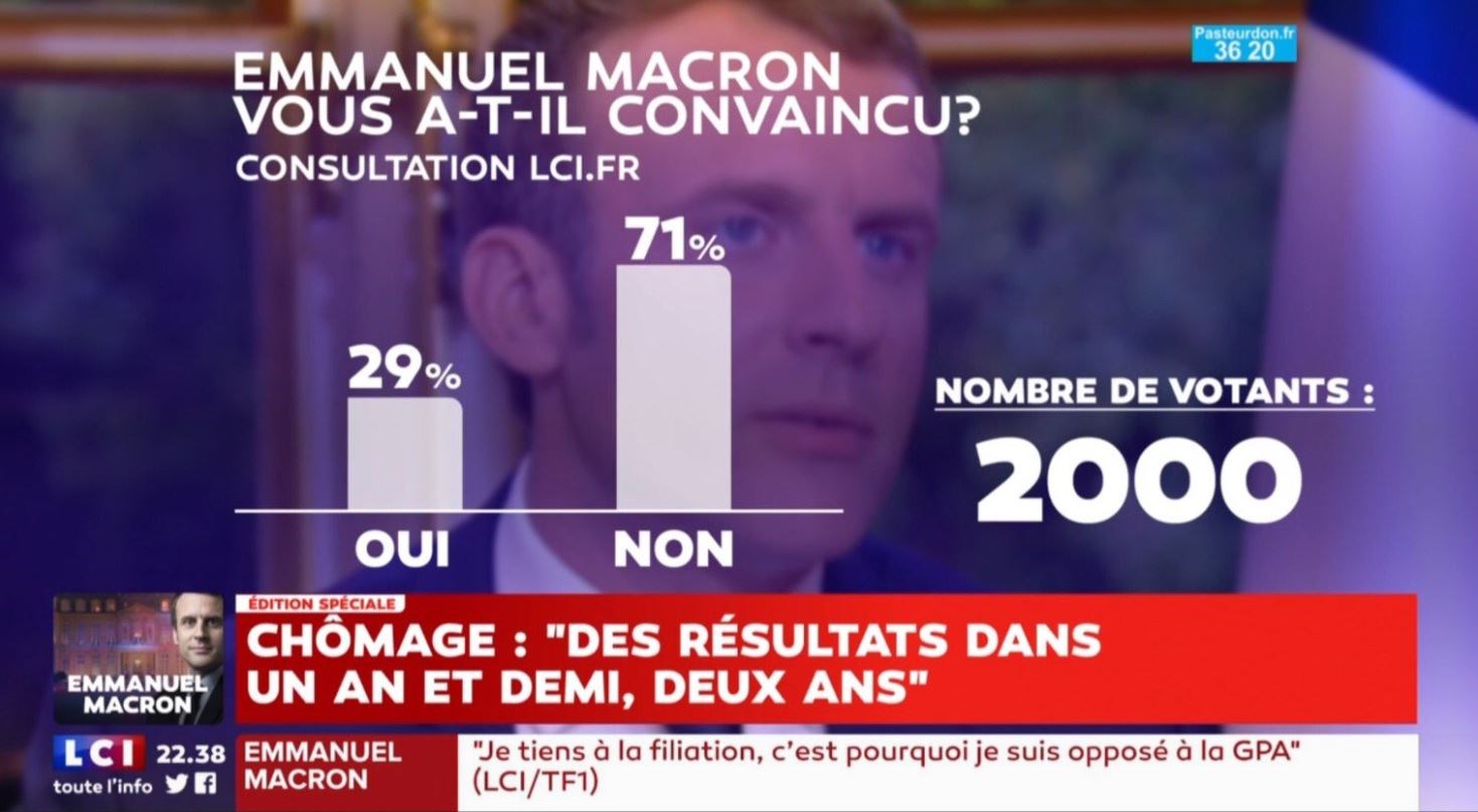 Έτσι σε γκάλοπ που διενεργήθηκε αμέσως μετά τη συνέντευξη, ελάχιστοι πείστηκαν. Συγκεκριμένα, σε δείγμα 2.000 ερωτηθέντων, το 71% υποστήριξε ότι δεν πείστηκε από τη συνέντευξη του Γάλλου Προέδρου και τη δήλωση ότι θα μειώσει την ανεργία σε δύο χρόνια.