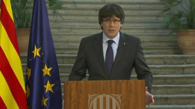 Ο Πουτζντεμόν εμφανίστηκε δίπλα σε μια καταλανική και μια ευρωπαϊκή σημαία. Στη γραπτή εκδοχή του τηλεοπτικού διαγγέλματος που μεταδόθηκε παράλληλα υπογράφει ως «Κάρλες Πουτζντεμόν, πρόεδρος της Τζενεραλιτάτ (κυβέρνησης) της Καταλονίας».