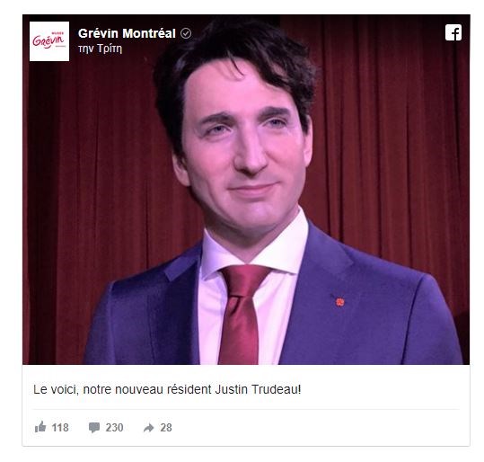 Στο Μουσείο Κέρινων Ομοιωμάτων του Μόντρεαλ παρουσιάστηκε κέρινο ομοίωμα του πρωθυπουργού του Καναδά, Τζάστιν Τριντό, το οποίο τον αναπαριστάνει εμφανώς μεγαλύτερο σε ηλικία.
