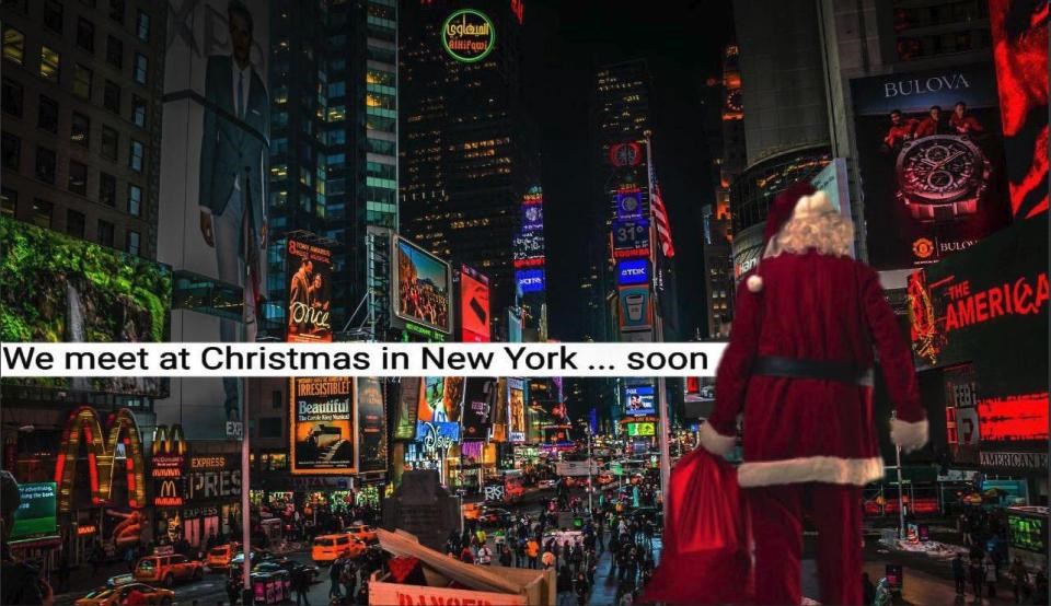 Στις δύο πρώτες εικόνες αναγράφεται “Σύντομα στις διακοπές σας”, στα αγγλικά, τα γαλλικά και τα γερμανικά, ενώ στην τελευταία υπάρχει η λεζάντα “Θα τα πούμε στη Νέα Υόρκη… σύντομα”.