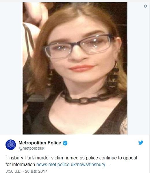Όπως ανακοίνωσε η Μητροπολιτική Αστυνομία του Λονδίνου, το πτώμα της άτυχης 22χρονης εντοπίστηκε δύο ημέρες μετά τα Χριστούγεννα στο πάρκο Finsbury, στα νότια της βρετανικής πρωτεύουσας.