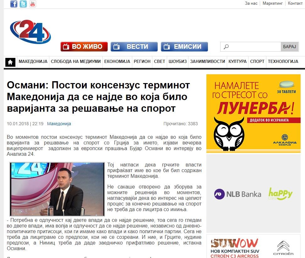 Μιλώντας σε εκπομπή της τηλεόρασης «24» ο κ.Οσμάνι, δήλωσε πως η Αθήνα αποδέχεται ονομασία που θα περιέχει τον όρο Μακεδονία, κάνοντας λόγο για προτάσεις που υπάρχουν στο τραπέζι των διαπραγματεύσεων, χωρίς όμως να δώσει λεπτομέρειες για αυτές. Ο ίδιος επεσήμανε πως και στον κυβερνητικό συνασπισμό στα Σκόπια, υπάρχει συναίνεση πως ο όρος «Μακεδονία» θα πρέπει να υπάρχει στη νέα σύνθετη ονομασία, χωρίς όμως να προχωρήσει περισσότερο.