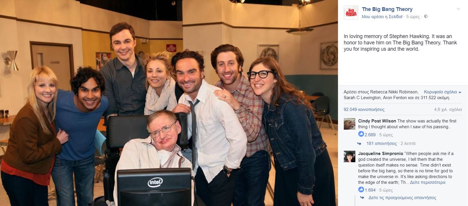 “Στη μνήμη του Στίβεν Χόκινγκ. Ήταν τιμή μας να τον έχουμε στο Big Bang Theory. Σε ευχαριστούμε που ενέπνευσες εμάς και τον κόσμο”, ήταν το μήνυμα με το οποίο συνόδευσαν τη φωτογραφία.