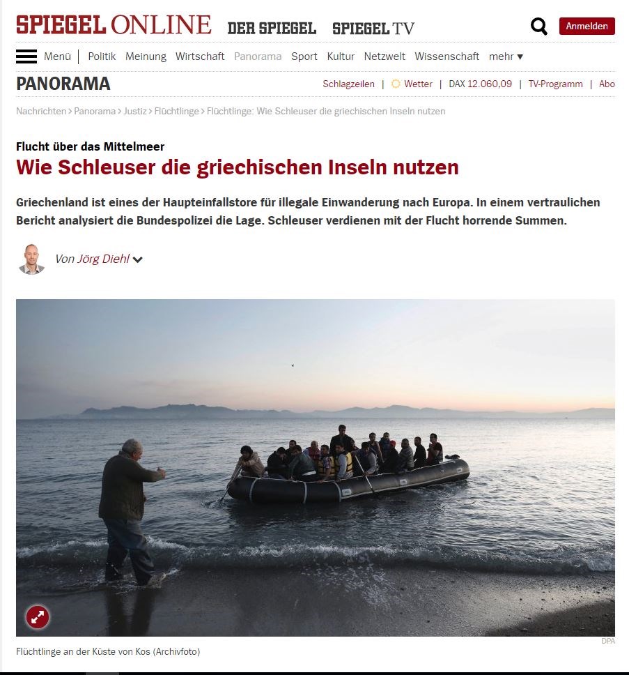 To Spiegel σημειώνει ότι «οι δουλέμποροι επιλέγουν, σύμφωνα με την ανάλυση, συνειδητά τα ελληνικά νησιά, τα κέντρα υποδοχής των οποίων είναι κατάμεστα από πρόσφυγες. Λόγω αυτής της κατάστασης εκτάκτου ανάγκης οι άνθρωποι μεταφέρονται συχνά στην ηπειρωτική Ελλάδα, πράγμα που “ανοίγει το παράθυρο ευκαιρίας για απλούστερα ταξίδια προς τη δυτική Ευρώπη”, λέει η ομοσπονδιακή αστυνομία της Γερμανίας. Αυτή η πρακτική των ελληνικών Αρχών αποδεικνύεται ως εκ τούτου “ολοένα και περισσότερο ως πόλος έλξης για την παράνομη μετανάστευση από την Τουρκία”».