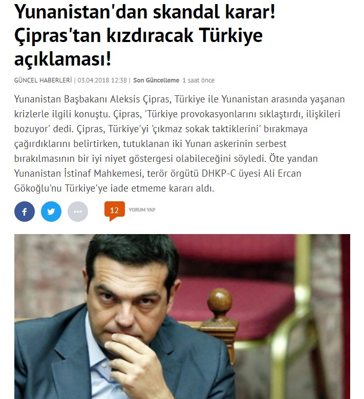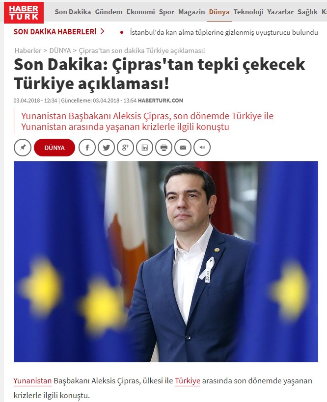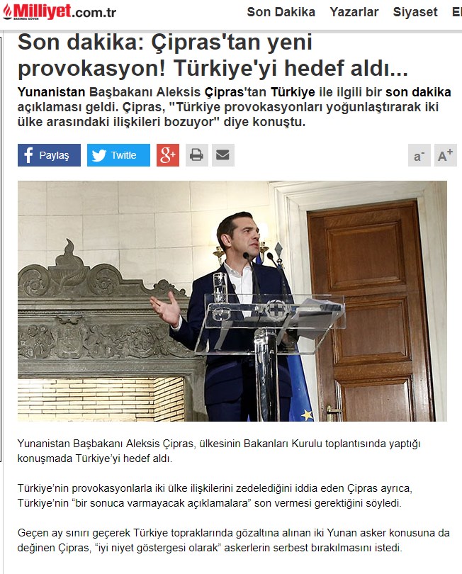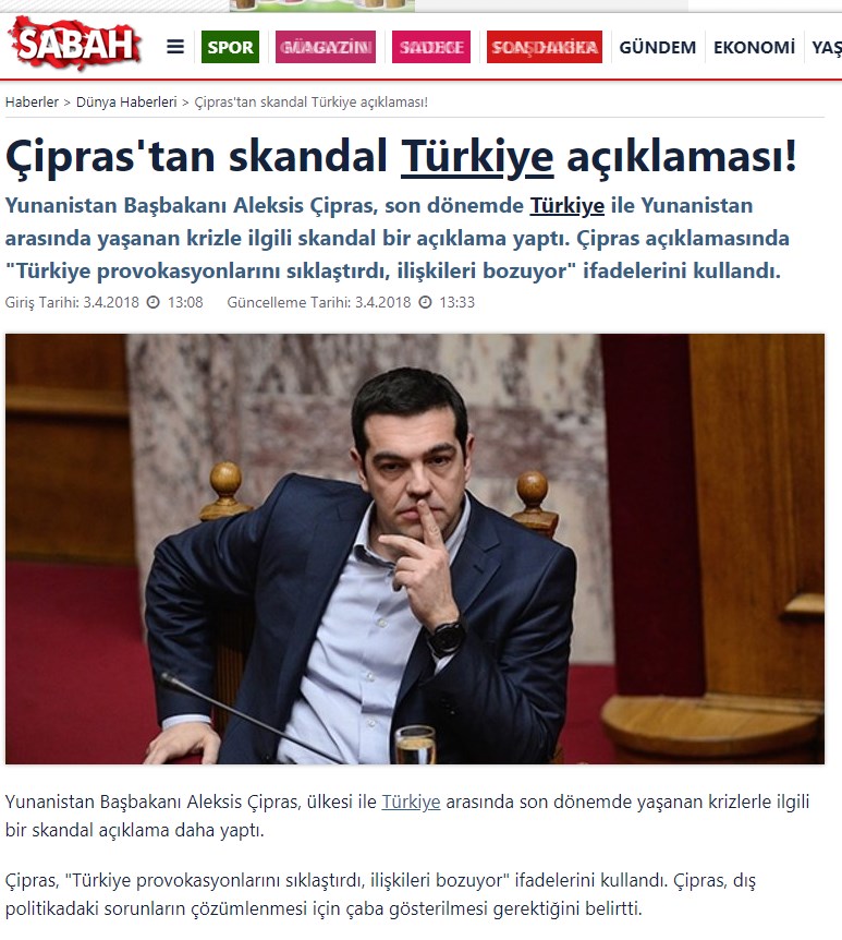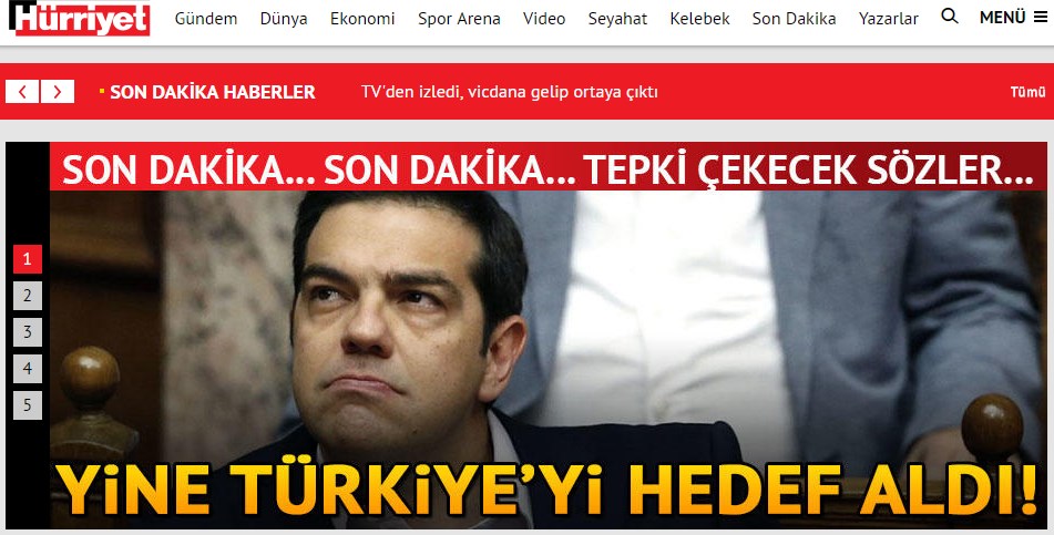 Τα περισσότερα δημοσιεύματα κάνουν λόγο για προκλητικές δηλώσεις από πλευράς του Έλληνα Πρωθυπουργού. Η Milliyet γράφει “Νέα πρόκληση από τον Τσίπρα – Στοχοποιεί την Τουρκία”. Η Hurriyet αναφέρει ότι στην ομιλία του κατηγόρησε την Τουρκία ότι προσπαθεί να διαταράξει τις διμερείς σχέσεις. Η Sabah κάνει λόγο για σκανδαλώδεις δηλώσεις του πρωθυπουργού, που έκανε λόγο για αυξημένες τουρκικές προκλήσεις.