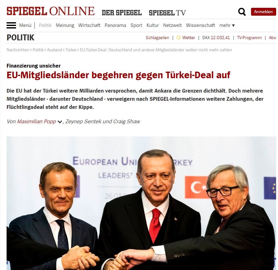 Σύμφωνα με το δημοσίευμα μετά από έρευνα του Spiegel από το δίκτυο της Ευρωπαϊκής Ερευνητικής Συνεργασίας (ΕΚΠ), είναι προφανώς ασαφές πότε θα δοθούν τα χρήματα. Με βάση εσωτερικά έγγραφα της ΕΕ αποκαλύπτεται ότι πολλές χώρες της Ένωσης έχουν διαμαρτυρηθεί επανειλημμένα για τη σχεδιαζόμενη χρηματοδότηση της Τουρκίας.