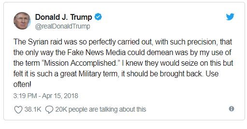 “Η επιδρομή κατά της Συρίας πραγματοποιήθηκε τόσο τέλεια, με τέτοια ακρίβεια, ώστε τα ΜΜΕ των Κατασκευασμένων Ειδήσεων θα μπορούσαν να την μειώσουν μόνο μέσω της χρήσης του όρου “Αποστολή Εξετελέσθη” από εμένα,” έγραψε χαρακτηριστικά ο πρόεδρος Τραμπ στο Twitter.