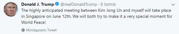 Στην ανάρτησή του ο κ. Τραμπ ανέφερε χαρακτηριστικά πως «η πολυαναμενόμενη συνάντηση με τον Κιμ Γιονγκ Ουν θα πραγματοποιηθεί στη Σιγκαπούρη στις 12 Ιουνίου». Συμπληρώνοντας ο 45ος Πρόεδρος των ΗΠΑ ανέφερε ότι «και οι δύο θα προσπαθήσουμε να κάνουμε μία πολύ ξεχωριστή στιγμή για την Παγκόσμια Ειρήνη».
