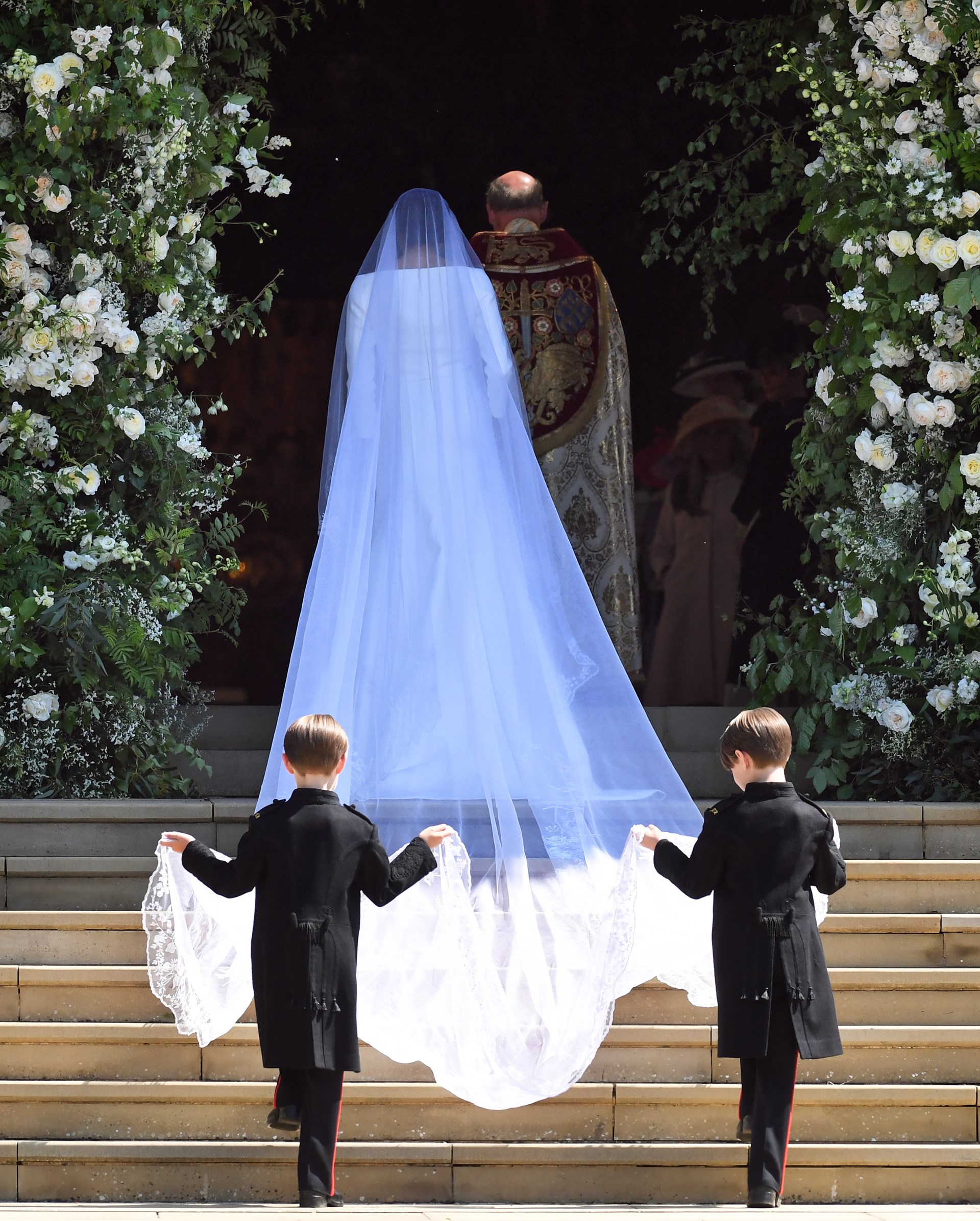 Σύμφωνα με την επιθυμία της Μέγκαν, το πέπλο μήκους πέντε μέτρων ήταν κεντημένο με λουλούδια που αντιπροσωπεύουν τις 53 χώρες της Κοινοπολιτείας. Η νύφη πρόσθεσε επίσης δύο λουλούδια της επιλογής της, εκ των οποίων μια παπαρούνα της Καλιφόρνιας, πολιτεία από την οποία κατάγεται.