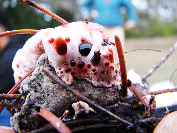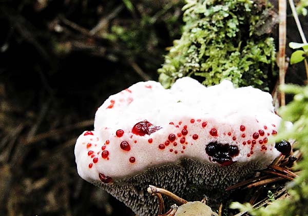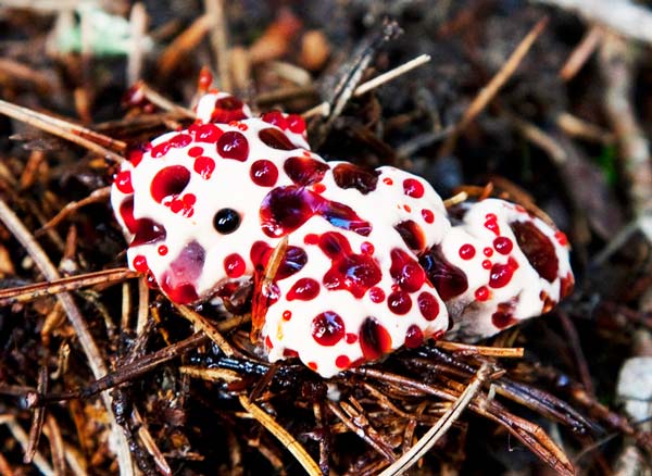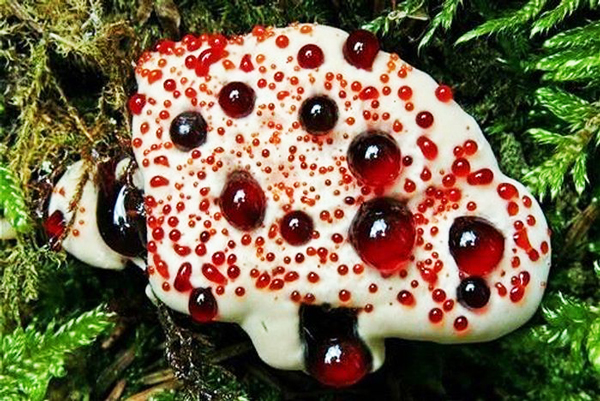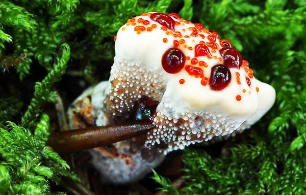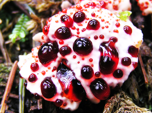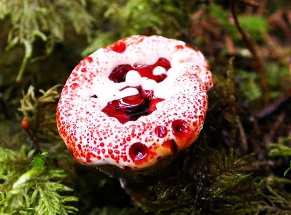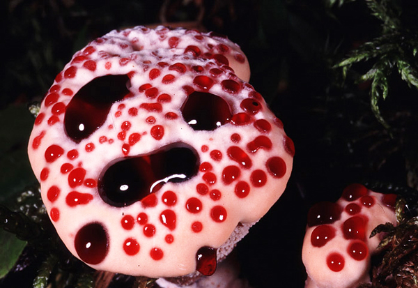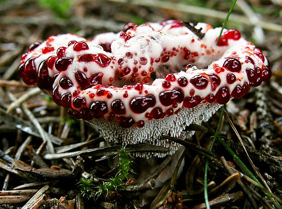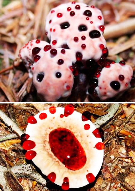 Σχεδόν εξ ολοκλήρου λευκό («καπέλο» και «πόδι»), το εντυπωσιακό αυτό μανιτάρι φέρει στην επιφάνειά του κατακόκκινες υγρές κηλίδες που μοιάζουν με αίμα, δίνοντας την εντύπωση στο θεατή ότι ο εν λόγω μύκητας… αιμορραγεί από παντού!