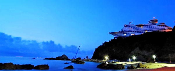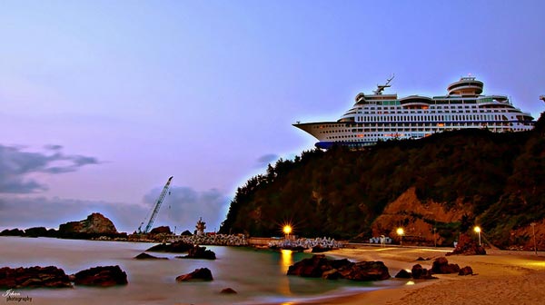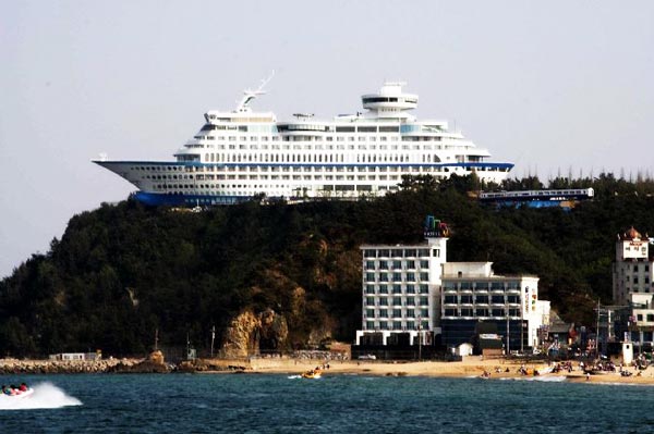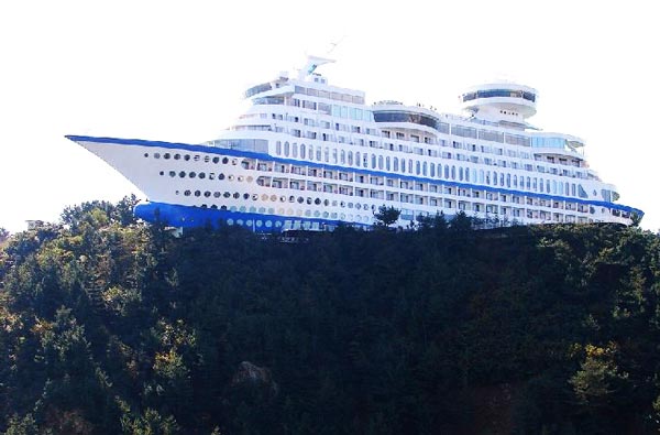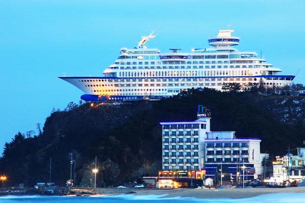 Ένα από τα πλέον πρωτότυπα ξενοδοχεία στον κόσμο, το The Sun Cruise Hotel βρίσκεται πάνω σε ένα βουνό, στην περιοχή Jeongdongjin της Νότιας Κορέας. Η περιοχή είναι δημοφιλής προορισμός για ερωτευμένους, και όχι μόνο, και φημολογείται πως διαθέτει την καλύτερη θέα της ανατολής του ηλίου στη χώρα. Άνoιξε τις πύλες του στο κοινό το 2002 και πρόκειται στην ουσία για ένα κρουαζιερόπλοιο ξηράς, που προσφέρει στους επισκέπτες του υψηλής ποιότητας υπηρεσίες. Το ξενοδοχείο έχει 165 μέτρα μήκος, 45 μέτρα ύψος και ζυγίζει ούτε λίγο ούτε πολύ περίπου 30.000 τόνους, ενώ διαθέτει 211 δωμάτια, πολυτελή εστιατόρια, πισίνες και περιστρεφόμενο κλαμπ στο κατάστρωμα.