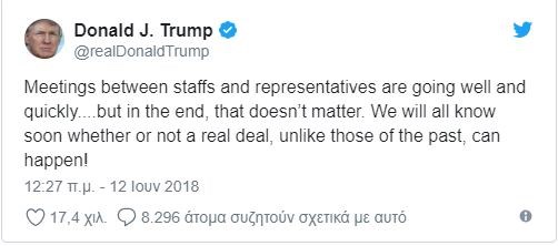 Πριν από λίγο ο Ντόναλντ Τραμπ σε ανάρτησή του στο Twitter ανέφερε: “Οι συναντήσεις μεταξύ των συμβούλων και των αντιπροσώπων πάνε καλά και γρήγορα… Στο τέλος όμως αυτό δεν έχει σημασία. Θα ξέρουμε όλοι σίγουρα αν μια πραγματικά καλή συμφωνία, σε αντίθεση με αυτές του παρελθόντος, μπορεί να πραγματοποιηθεί”.