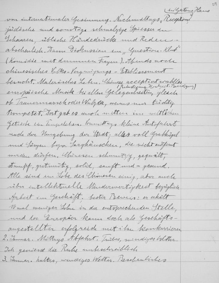 Σε ένα άλλο σημείο γράφει πάλι για τους Κινέζους -τους οποίους φαίνεται ότι δεν χώνευε καθόλου- ότι «ακόμη και όταν υποχρεώνονται να δουλεύουν σαν τα άλογα, ποτέ δεν δίνουν την εντύπωση ότι υποφέρουν συνειδητά. Είναι μια περίεργη χώρα σαν κοπάδι… που θυμίζει μάλλον αυτόματα παρά ανθρώπους».