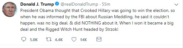 “Ο πρόεδρος Ομπάμα νόμιζε ότι η Διεφθαρμένη Χίλαρι θα κέρδιζε τις εκλογές. Έτσι όταν ενημερώθηκε από το FBI σχετικά με την Εμπλοκή της Ρωσίας, είπε ότι δεν συνέβη, ότι δεν ήταν σημαντικό και δεν έκανε τίποτα σχετικά με αυτό. Όταν νίκησα, έγινε μεγάλο θέμα με το Αλλοιωμένο Κυνήγι Μαγισσών υπό τον Στρζοκ!” Έγραψε ο Αμερικανός πρόεδρος στο Twitter.