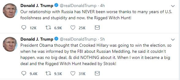 Νωρίτερα, υπονομεύοντας την ίδια την θέση του πριν από την συνάντησή του με τον Πούτιν, ο Τραμπ απέδωσε με ανάρτησή του στο Twitter την κακή κατάσταση των αμερικανο-ρωσικών σχέσεων στην παρελθόντων ετών «βλακεία» της Ουάσινγκτον και στο «κυνήγι μαγισσών» του FBI, που ερευνά την ρωσική ανάμειξη στις αμερικανικές προεδρικές εκλογές του 2016.