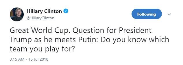 «Εξαιρετικό Παγκόσμιο Κύπελλο. Ερώτηση προς τον πρόεδρο Τραμπ πριν συναντήσει τον Πούτιν: Ξέρεις με ποια ομάδα παίζεις; », έγραψε τον λογαριασμό της στο Twitter η Χίλαρι Κλίντον, αμφισβητώντας ευθέως την πίστη του Ντόναλντ Τραμπ.
