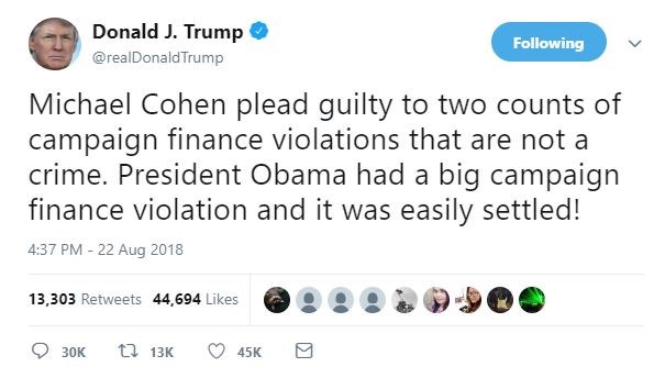 «Ο πρόεδρος Ομπάμα κατέστη υπεύθυνος για μια σοβαρή παράβαση στη χρηματοδότηση της προεκλογικής του εκστρατείας και το διευθέτησε εύκολα!» συμπλήρωσε ο Τραμπ.