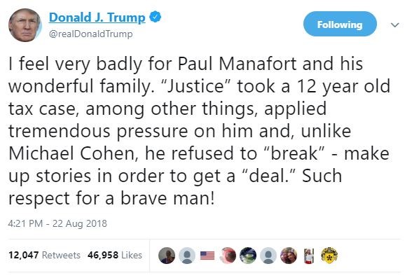 Την ίδια ώρα, ο Αμερικανός πρόεδρος έγραψε στο Twitter πως νιώθει «τόσο σεβασμό για έναν θαρραλέο άνδρα» όπως ο Πολ Μάναφορτ, ο οποίος κρίθηκε ένοχος για τραπεζική απάτη και φοροδιαφυγή.