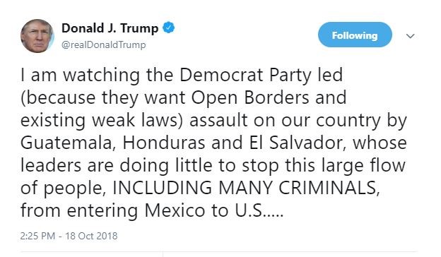 «Θα πρέπει, με τους ισχυρότερους όρους, να ζητήσω από το Μεξικό να σταματήσει αυτή την επίθεση — και αν δεν μπορεί να το κάνει, τότε θα καλέσω τον στρατό των ΗΠΑ και ΘΑ ΚΛΕΙΣΩ ΤΑ ΝΟΤΙΑ ΣΥΝΟΡΑ ΜΑΣ!» έγραψε ο Τραμπ, o οποίος επανέφερε ένα από τα κύρια θέματα της νικηφόρας προεκλογικής εκστρατείας του το 2016, τρεις εβδομάδες πριν από τις βουλευτικές εκλογές που είναι κρίσιμες για τη θητεία του.