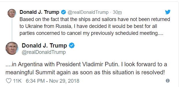 Όπως έγραψε σε ανάρτησή του στο twitter ο Τραμπ, ευελπιστεί “σε μία επουσιώδη σύνοδο ξανά, αμέσως μόλις επιλυθεί η κατάσταση” κατηγορώντας τη Ρωσία που κρατά ακόμη τα ουκρανικά πλοία και τους ναύτες μετά το θερμό επεισόδιο στο Στενό του Κερτς.