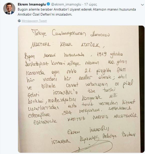 Τη δυσαρέσκεια του τουρκικού υπουργείου Άμυνας προκάλεσε ο νέος δήμαρχος Κωνσταντινούπολης.Μία μόνο ημέρα μετά την εκλογική διαδικασία και πριν αναλάβει επισήμως τα καθήκοντα του στο δήμο Κωνσταντινούπολης, ο Εκρέμ Ιμάμογλου επισκέφθηκε το μαυσωλείο του Κεμάλ και κατέθεσε στεφάνι υπογράφοντας ως δήμαρχος Κωνσταντινούπολης.Άμεση ήταν η αντίδραση του τουρκικού υπουργείου Άμυνας, λέγοντας ότι όλο αυτό είναι εκτός πρωτοκόλλου και ότι δεν τηρήθηκαν οι κανονισμοί.