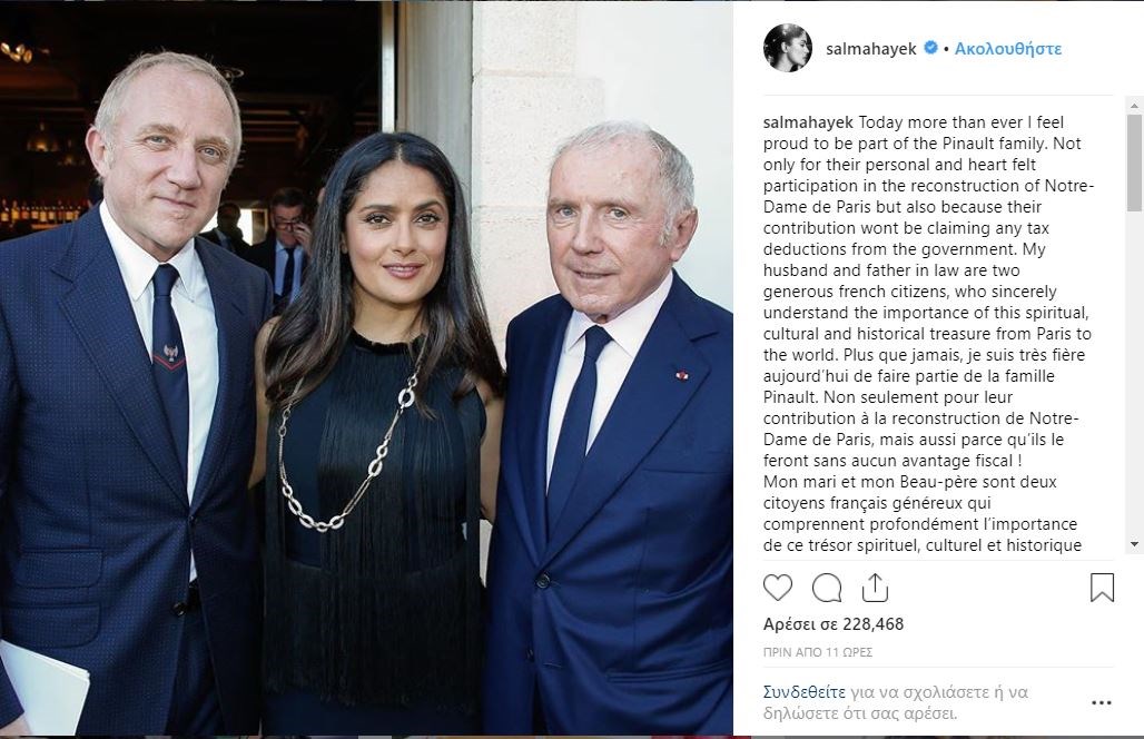 Υπερήφανη για τη γεναιοδωρία της οικογένειας της, δήλωσε η Μεξικανή ηθοποιός Σάλμα Χάγιεκ με αφορμή την δωρεά των 100 εκατομμυρίων ευρώ που προσέφερε ο σύζυγος και ο πεθερός της για την ανακατασκευή του ναού της Παναγίας των Παρισίων, μετά την καταστροφική πυρκαγιά.