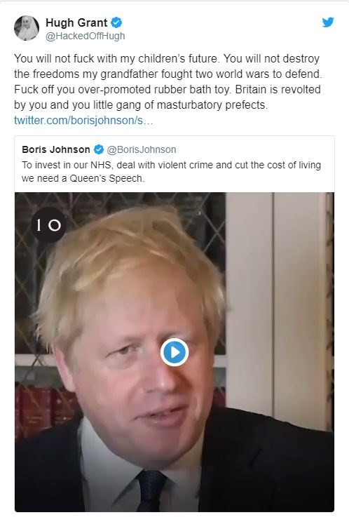 Ξέσπασε ο Βρετανός σταρ Χιου Γκραντ κατά του πρωθυπουργού της χώρας Μπόρις Τζόνσον μετά την απόφασή του να αναστείλει τη λειτουργία του Κοινοβουλίου.