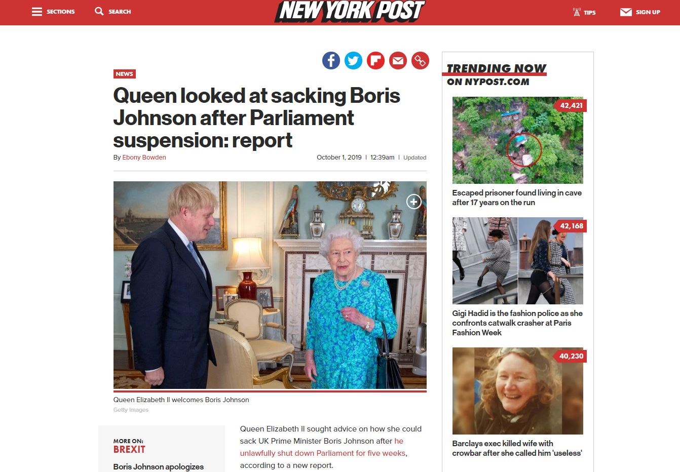 Αποφασισμένη να αναλάβει δράση, προκειμένου να καθαιρέσει τον Μπόρις Τζόσον από τον πρωθυπουργικό θώκο παρουσιάζεται η βασίλισσα Ελισάβετ.Όπως αναφέρει η New York Post στην ηλεκτρονική της διεύθυνση, η βασίλισσα Ελισάβετ αναζητεί νομικές συμβουλές σχετικά με τον πως θα μπορούσε να «αποβάλλει» τον Μπόρις Τζόνσον από την πρωθυπουργική θέση, έπειτα από την παράνομη αναστολή λειτουργίας του κοινοβουλίου που διέταξε.