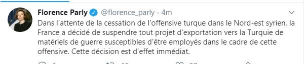 Με ανάρτησή της στο twitter η Γαλλίδα υπουργός Εθνικής Άμυνας Φλορένς Παρλί ανακοίνωσε πως “εν αναμονή του τερματισμού της τουρκικής επιχείρησης στη βορειοανατολική Συρία, η Γαλλία αναστέλλει την εξαγωγή όπλων στην Τουρκία που θα μπορούσαν να χρησιμοποιηθούν σ’ αυτήν την επέμβαση.Η απόφαση έχει άμεση ισχύ”.