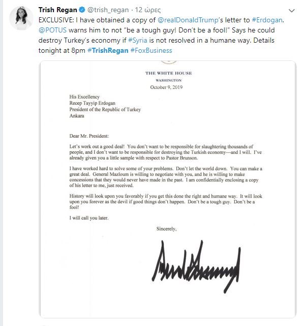 Υπενθυμίζεται ότι ο Ντόναλντ Τραμπ είχε αποστείλει επιστολή στον Τούρκο ομόλογό του στις 9 Οκτωβρίου, όπου του έλεγε “να μην το παίζει σκληρόw άνδρας” και να μην κάνει ανοησίες. Την επιστολή εξασφάλισε η δημοσιογράφος του FOX, Tρις Ρίγκαν που την ανήρτησε στον λογαριασμό της στο twitter και προκάλεσε αντιδράσεις με το ύφος της σύνταξής της ακόμη και στο εσωτερικό των ΗΠΑ.