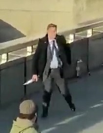 Βίντεο που «ανέβηκε» στα social media δείχνουν αστυνομικούς να πυροβολούν έναν άνδρα και έναν άλλο άνδρα με κοστούμι να απομακρύνεται από το σημείο κρατώντας ένα μαχαίρι.