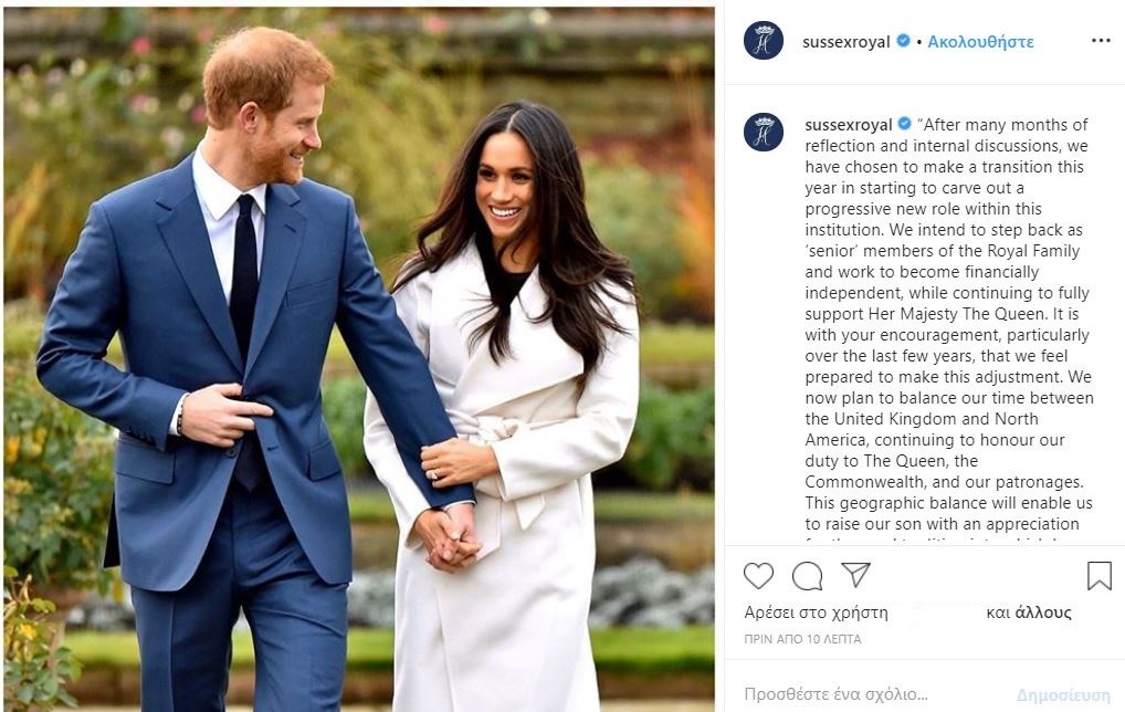 Με ανακοίνωσή τους στα social media μία ημέρα αφότου επέστρεψαν από το έξι εβδομάδων διάλειμμά τους γνωστοποίησαν ότι παραιτούνται από μέλη της βασιλικής οικογένειας, θα ανεξαρτητοποιηθούν οικονομικά και πλέον θα μετακινούνται ανάμεσα σε Ηνωμένο Βασίλειο και Βόρεια Αμερική.