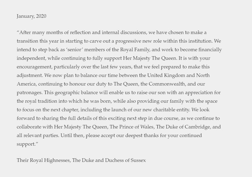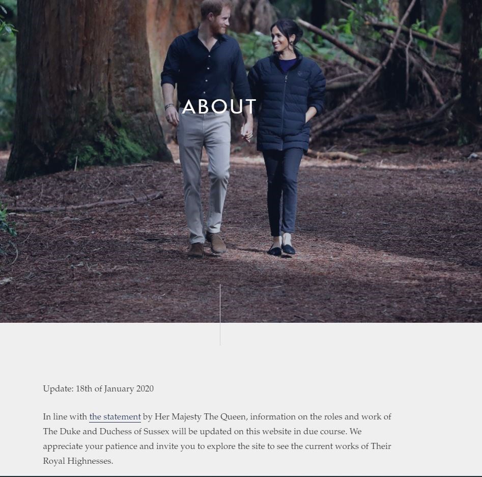 Μάλιστα, στην κεντρική σελίδα του site τους ενημερώνουν τους ακολούθους τους πως στο πλαίσιο της ανακοίνωσης της βασίλισσας, πληροφορίες σχετικά με τους ρόλους και την εργασία του Δούκα και της Δούκισσας του Σάσεξ θα ανακοινωθούν σύντομα.