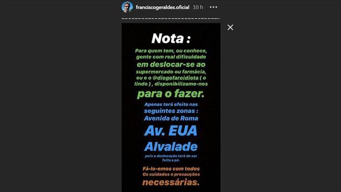 Το μήνυμα του ποδοσφαιριστή Φρανσίσκο Ζεράλδες έχει κάνει τον γύρο του διαδικτύου, καθώς συμβολίζει όσα πρέπει να κάνει κανείς στα πλαίσια της αλληλεγγύης, αυτές τις δύσκολες ημέρες. Ο Ζεράλδες προσπαθεί να συμπαρασταθεί σε όλους όσοι είναι περιορισμένοι στο σπίτι, λόγω της καραντίνας για τον κορονοϊό και δεν μπορούν να κάνουν για διαφορετικούς λόγους ο καθένας, τις απαραίτητες αγορές. Με ανάρτησή του στο instagram, ο πρώην άσος της ΑΕΚ και νυν της Σπόρτινγκ Λισαβόνας ζητεί από όποιον έχει ανάγκη ή γνωρίζει ανθρώπους που έχουν ανάγκη να επικοινωνήσουν μαζί του, ώστε να είναι αυτός που θα αναλάβει να τους κάνει τα ψώνια είτε σε σούπερ μάρκετ είτε σε φαρμακείο.