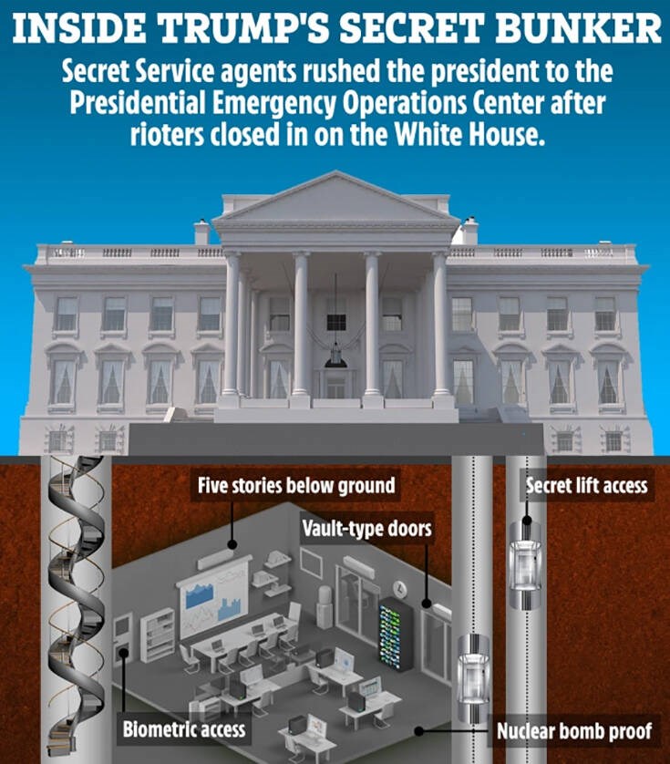 Τώρα ο πρόεδρος Τραμπ μεταφέρθηκε στο καταφύγιο όπως μετέδωσε το CNN, ενώ σύμφωνα με πηγή που μίλησε στο Associated Press,ο Τραμπ παρέμεινε εκεί για μία ώρα περίπου. Κάτω από τον Λευκό Οίκο και άλλα κυβερνητικά κτίρια μέσα και γύρω από την Ουάσινγκτον υπάρχει μία ολόκληρη πόλη. Όσο για το τι είναι γνωστό για το καταφύγιο όπου φυγαδεύτηκε ο Αμερικανός πρόεδρος το βράδυ της 29ης Μαΐου, αναφέρεται ότι το 2018, το Drive είχε μεταδώσει ότι πέρα από την Αίθουσα Ειδικών Καταστάσεων (Situation Room), το καταφύγιο είναι εντελώς διαφορετική και πολύ πιο ασφαλής εγκατάσταση και τα τελευταία χρόνια επεκτάθηκε σε ένα πολύ πιο μεγάλο και μοντέρνο συγκρότημα βαθιά θαμμένο κάτω από τη Δυτική Πτέρυγα, σύμφωνα με την έκθεση.