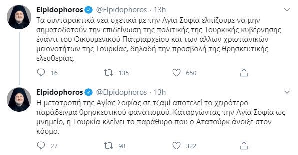 “Tα συνταρακτικά νέα σχετικά με την Αγία Σοφία ελπίζουμε να μην σηματοδοτούν την επιδείνωση της πολιτικής της τουρκικής κυβέρνησης έναντι του Οικουμενικού Πατριαρχείου και των άλλων χριστιανικών μειονοτήτων της Τουρκίας, δηλαδή την προσβολή της θρησκευτικής ελευθερίας”, προσθέτει σε άλλη ανάρτηση ο Αρχιεπίσκοπος Αμερικής.