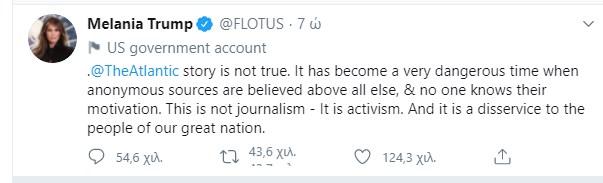 «Το άρθρο του The Atlantic δεν είναι αληθές», έγραψε η Μελάνια Τραμπ στο Twitter. «Οι καιροί έχουν γίνει πολύ επικίνδυνοι όταν πιστεύουμε πάνω από όλους ανώνυμες πηγές, των οποίων κανείς δεν γνωρίζει τα κίνητρα. Αυτό δεν είναι δημοσιογραφία, είναι ακτιβισμός. Και δεν προσφέρει καμία υπηρεσία στους πολίτες του μεγάλου έθνους μας», κατήγγειλε η ίδια.