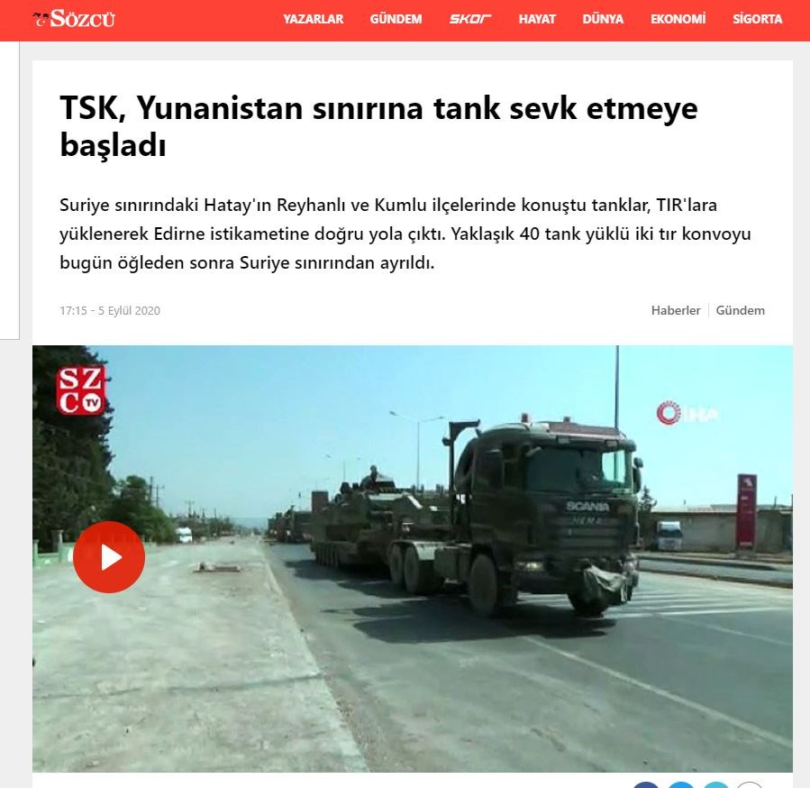 Σύμφωνα με τις πληροφορίες, περίπου 2 κομβόι φορτηγών ξεκίνησαν σήμερα το μεσημέρι από τα σύνορα Τουρκίας-Συρίας μεταφέροντας 40 τανκ με τελικό προορισμό την Αδριανούπολη. Τα τανκ θα μεταφερθούν από το λιμάνι της Αλεξανδρέττας με τρένο στην Αδριανούπολη.