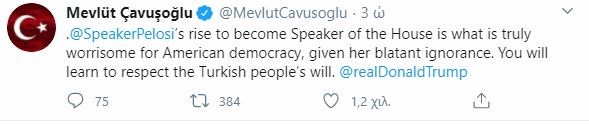 Ο Τούρκος υπουργός Εξωτερικών δεν έκρυψε την έντονη ενόχλησή του. «Το ανησυχητικό για την αμερικανική δημοκρατία είναι η ανάδειξη της Νάνσι Πελόζι στην προεδρία της Βουλής των Αντιπροσώπων, δεδομένης της σκανδαλώδους άγνοιάς της», έγραψε στο Twitter ο Μεβλούτ Τσαβούσογλου. «Θα μάθετε να σέβεστε τη βούληση του τουρκικού λαού», πρόσθεσε.