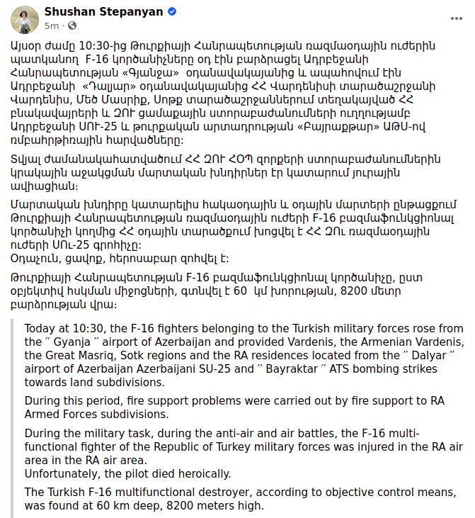 «Σήμερα στις 10:30 τουρκικά μαχητικά F-16 απογειώθηκαν από το αεροδρόμιο Γκιαντζά για να παράσχουν κάλυψη στα πλήγματα των ενόπλων δυνάμεων του Αζεϊρμπαϊτζάν στην πόλη Βαρντένις, στα χωριά Μετς Μάτσικ και Σότκ. Τουρκικό μαχητικό τύπου F-16 κατέριψε μαχητικό Su-25 το οποίο εκτελούσε στρατιωτική αποστολή. Ο πιλότος δυστυχώς σκοτώθηκε ηρωικά. Το τουρκικό μαχητικό βρισκόταν σε βάθος 60 χιλιομέτρων (στην επικράτεια του Αζερμπαϊτζάν) σε ύψος 8.200 μέτρων»