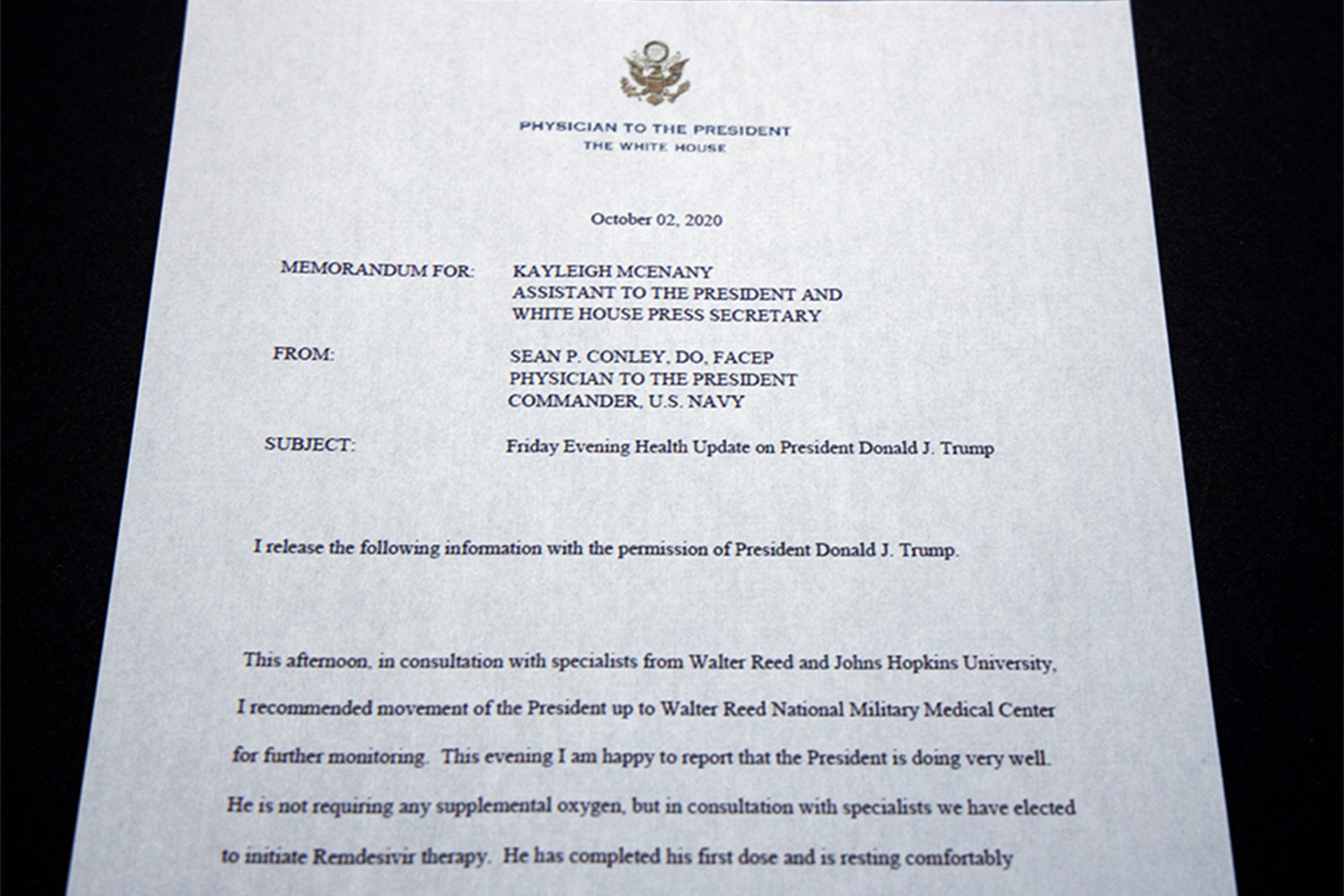 «Πάω καλά, νομίζω! Σας ευχαριστώ όλους. ΑΓΑΠΗ!!!», ανέφερε ο Πρόεδρος στην ανάρτησή του. Σημειώνεται ότι ο γιατρός του Λευκού Οίκου είπε ότι ο Πρόεδρος λαμβάνει μια πειραματική θεραπεία για την Covid-19, με πολυκλωνικά αντισώματα και έχει «υψηλό ηθικό» μολονότι αισθάνεται κόπωση. Πρόσθεσε ότι του χορήγησε μια δόση από το πειραματικό κοκτέιλ αντισωμάτων που αναπτύσσει η φαρμακευτική εταιρεία Regeneron και το οποίο έχει δώσει ενθαρρυντικά πρώτα αποτελέσματα στις κλινικές δοκιμές που έγιναν σε μικρό αριθμό ασθενών. Οι ειδικοί εξετάζουν τον Πρόεδρο και θα κάνουν συστάσεις για «τα επόμενα στάδια», σημείωσε ο Δρ Κόνλεϊ. Σύμφωνα με την ανακοίνωση, η Μελάνια Τραμπ έχει «ελαφρύ βήχα και πονοκέφαλο».