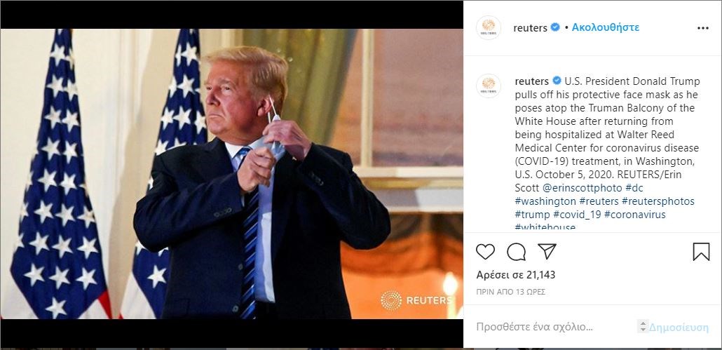 Ερωτήματα, ανησυχία, προβληματισμό εγείρει το εξιτήριο στον Αμερικανό πρόεδρο Ντόναλντ Τραμπ, έπειτα από μόλις τρεις ημέρες νοσηλείας και ενώ περισσότεροι από 200.000 Αμερικανοί έχουν πεθάνει από τον κορονοϊό. Η εμφάνισή του στο μπαλκόνι του Λευκού Οίκου επιστρέφοντας στον Λευκό Οίκο και κυρίως η κίνηση να βγάλει τη μάσκα πυροδότησε πλήθος αρνητικών αντιδράσεων με τους χρήστες των social media να κατηγορούν τον πρόεδρο για αμέλεια ή για θέατρο. Πολλοί σχολίασαν το χρώμα της επιδερμίδας του λέγοντας ότι τώρα είναι πιο πορτοκαλί ενώ άλλοι πίστεψαν ότι πρόκειται για σωσία.