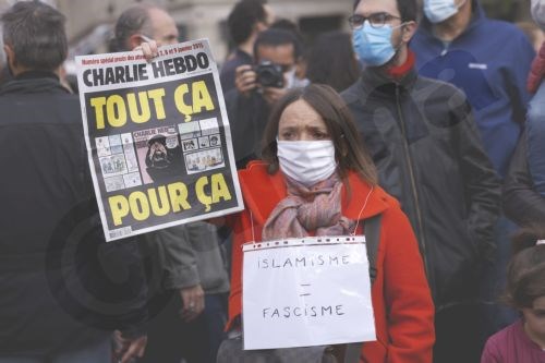 Κρατώντας πλακάτ που έγραφαν “Όχι στον ολοκληρωτισμό της σκέψης” και “Είμαι καθηγητής” τίμησαν την μνήμη του 47χρονου γάλλου καθηγητή, ο οποίος δολοφονήθηκε, έξω από το σχολείο όπου δίδασκε, επειδή είχε δείξει στους μαθητές του σατιρικά σκίτσα του Μωάμεθ.