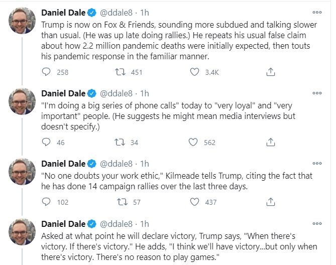 Αντιθέτως, ο απερχόμενος πρόεδρος και επίσης υποψήφιος για την προεδρία Ντόναλντ Τραμπ έδωσε τηλεφωνική συνέντευξη στο Fox News όπου ακουγόταν εξαντλημένος ενώ για άλλη μια φορά επιτέθηκε στο ίδιο το Fox για τον τρόπο μετάδοσης των ειδήσεων. Ο πρόεδρος Τραμπ είπε διάφορα ενδιαφέροντα μεταξύ άλλων.