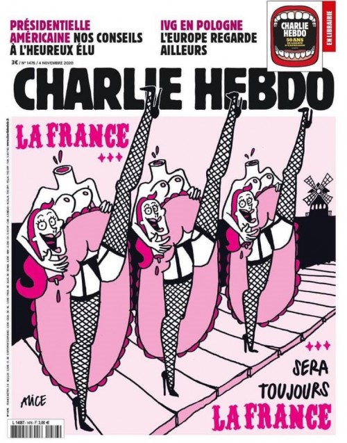 Ένα ακόμη εξώφυλλο του Charlie Hebdo προκαλεί αίσθηση. Το σατιρικό περιοδικό, λίγες ημέρες μετά την επίθεση στη Νίκαια, κυκλοφορεί με πρωτοσέλιδο τίτλο “H Γαλλία, θα παραμείνει Γαλλία” και στο εξώφυλλο απεικονίζονται αποκεφαλισμένες χορεύτριες του Καν Καν. Κρατάνε στο χέρι τους το κεφάλι τους και εξακολουθούν να χαμογελούν και να χορεύουν.