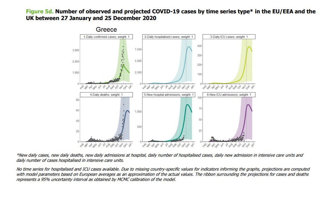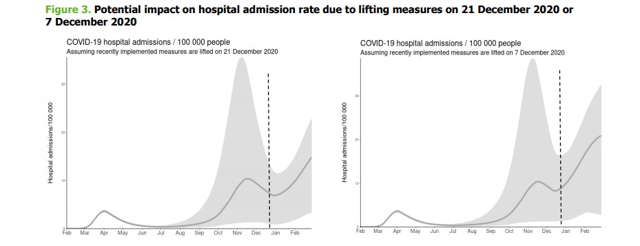 Σύμφωνα λοιπόν με το ECDC εάν τα μέτρα αρθούν στις 21 Δεκεμβρίου, προβλέπεται ότι θα μπορεί να υπάρξει αύξηση στον αριθμό των νοσηλειών ήδη από την πρώτη εβδομάδα του Ιανουαρίου. Εάν τα μέτρα αρθούν νωρίτερα, στις 7 Δεκεμβρίου 2020, η σχετική αύξηση ενδέχεται να αρχίσει πριν από τις 24 Δεκεμβρίου. Πρέπει επίσης να σημειωθεί ότι, καθώς η ποσοστιαία επίπτωση της πανδημίας θα εξακολουθεί να μειώνεται τον Δεκέμβριο, η χαλάρωση των περιορισμών νωρίτερα θα οδηγήσει σε ταχύτερη αύξηση των αριθμών κρουσμάτων, νοσηλειών και θανάτων.